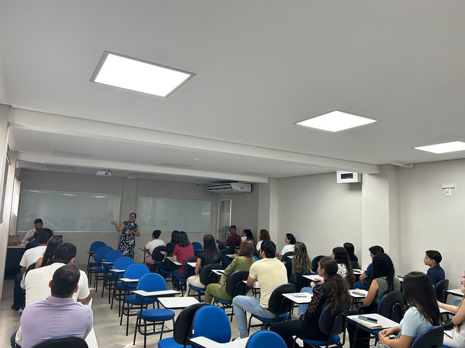A aula foi iniciada pela Professora Francielly Bordon, que fez uma breve introdução ao curso de Medicina, explicando os desafios e as responsabilidades que envolvem a formação de um profissional da área da saúde. Com uma didática envolvente, a professora destacou as oportunidades e as experiências que o curso oferece aos alunos, ressaltando a importância do comprometimento e da paixão pela profissão. Ela também abordou o papel fundamental das ligas acadêmicas na formação dos estudantes. A professora explicou como essas ligas proporcionam uma vivência prática além da sala de aula, permitindo aos alunos aprofundar seus conhecimentos em áreas específicas da Medicina, ao mesmo tempo em que contribuem para o desenvolvimento de habilidades essenciais para a carreira médica.