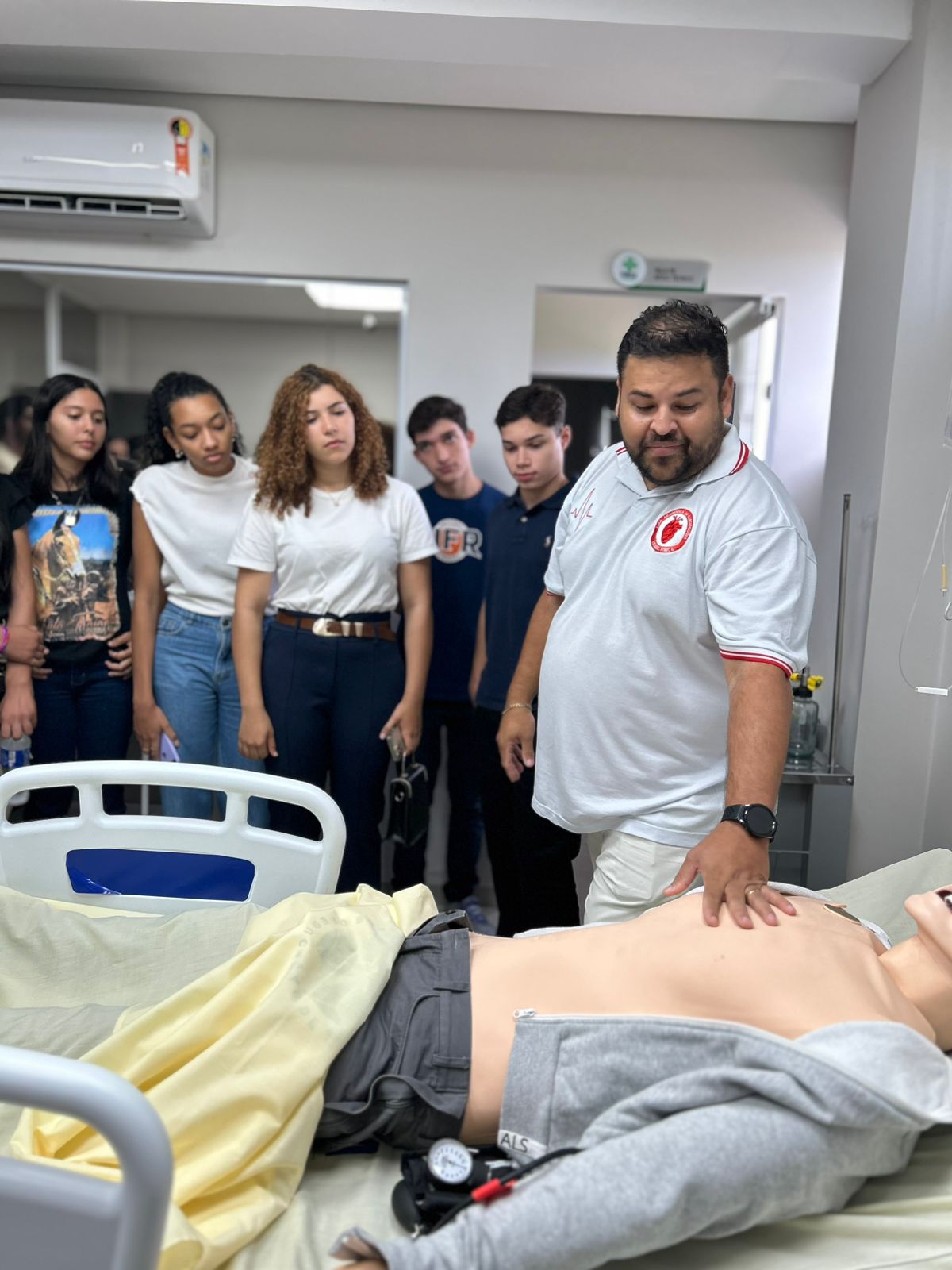 A atividade seguiu com a presença do Professor Dr. Mauro Lopes, que ministrou a aula prática. Ele levou os participantes a uma verdadeira imersão no dia a dia de um médico. Dr. Mauro compartilhou sua experiência como médico socorrista do SAMU, detalhando as situações de emergência e os cuidados essenciais no atendimento pré-hospitalar. Com uma abordagem prática e objetiva, ele demonstrou a técnica de massagem cardíaca, ensinando aos presentes os passos para realizar esse procedimento de forma eficaz, o que gerou grande entusiasmo entre os participantes, que puderam vivenciar a teoria na prática.