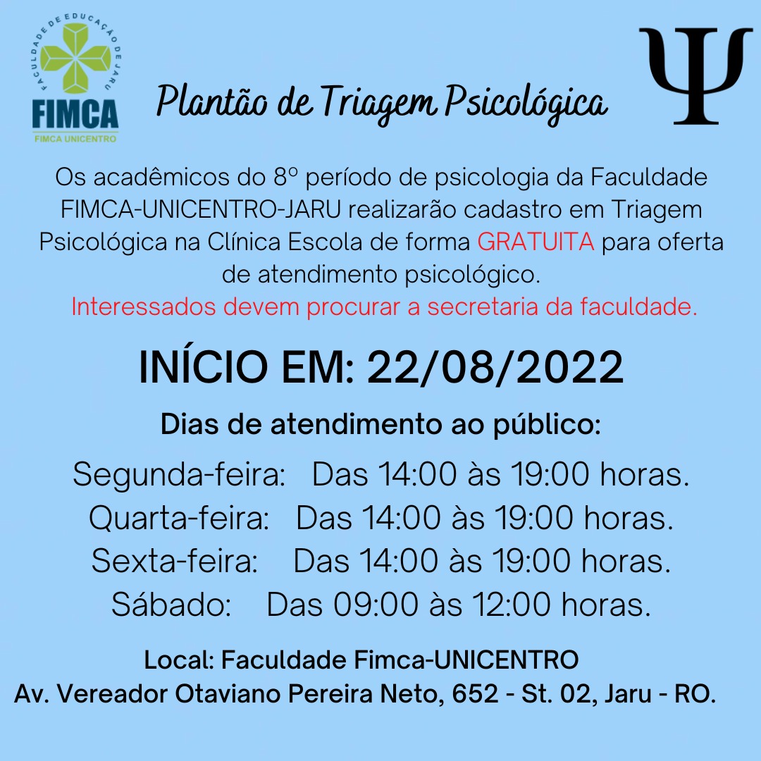 Os acadêmicos do curso de psicologia da Faculdade FIMCA Unicentro Jaru, estarão realizando na Clínica Escola de Psicologia, a triagem iniciará no dia 22 de agosto de 2022, e será realizada pelos acadêmicos do 8º período de psicologia, o intuito da triagem psicológica é realizar acolhimento na escuta da demanda e posteriormente no próximo semestre 2023.1, realizar psicoterapia com os pacientes cadastrados.